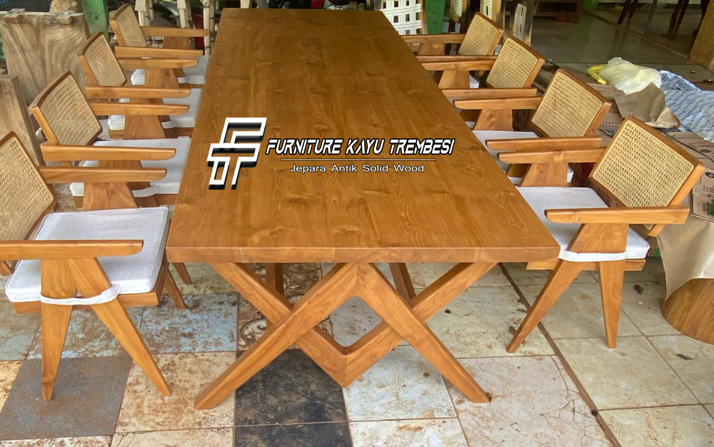 Meja Meeting Kayu Jati Solid ukuran 300x110x75cm aplikasi tepat untuk formasi set 8 kursi dengan empat berhadapan. Kursi model A kombinasi rotan opsi desain yang sempurna dengan paduan karakteristik antik minimalis modern pada furniture jepara ini.