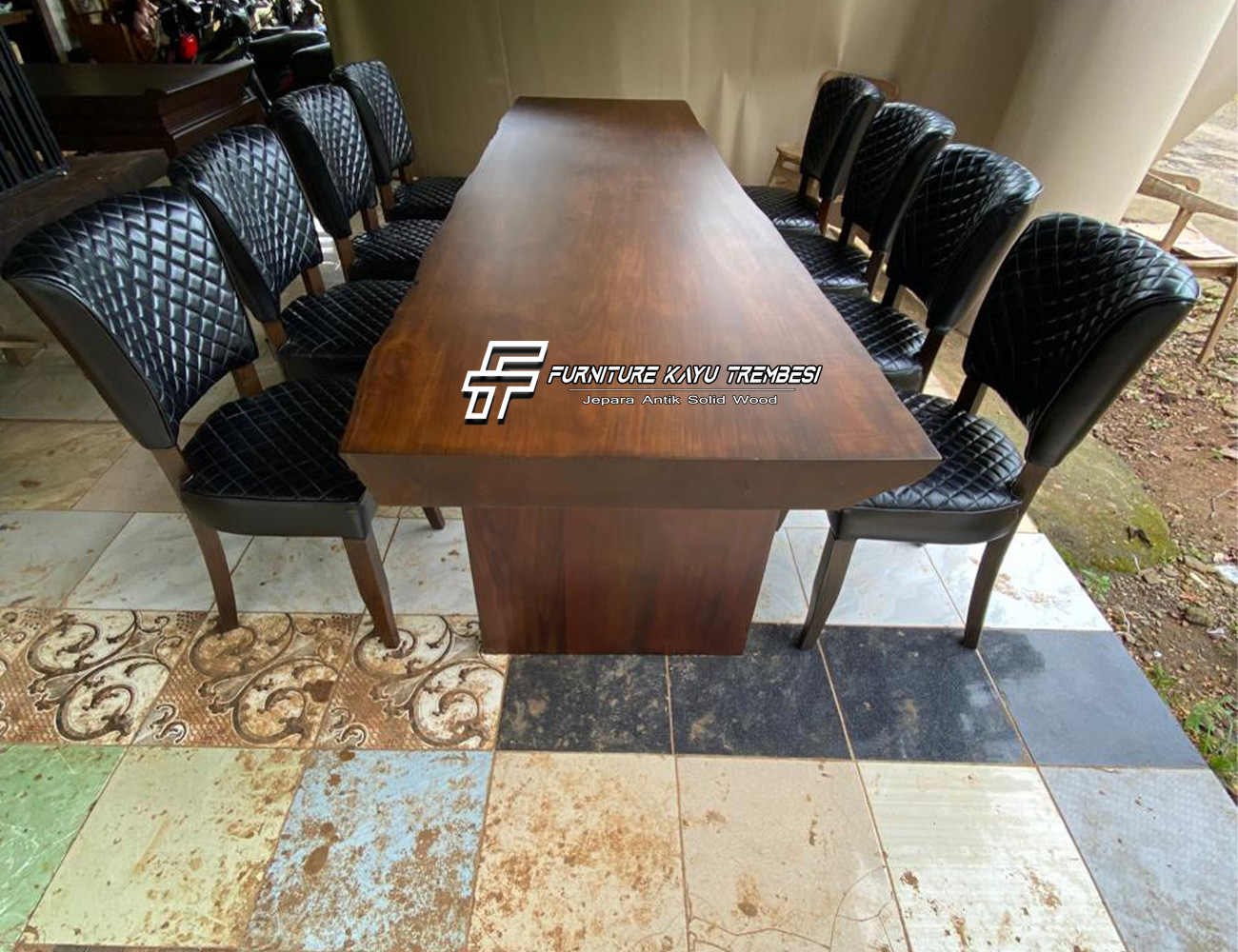 Jual Mebel Jepara material kayu jati solid perhutani blora dengan ukuran 300 x 80cm sisi alami asli satu pohon besar. Meja jati solid berbahan pilihan selain terbukti kualitasnya juga memiliki desain minimalis antik dengan formasi kursi cushion leather italy
